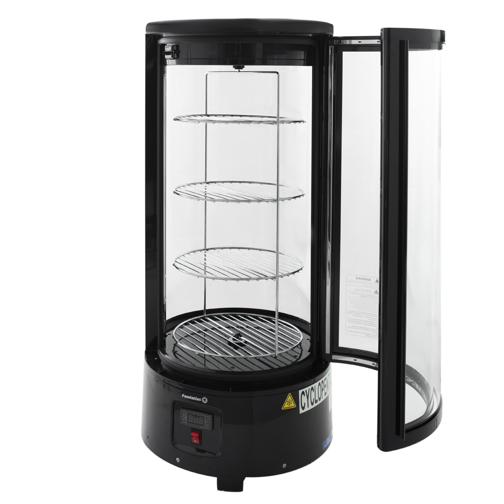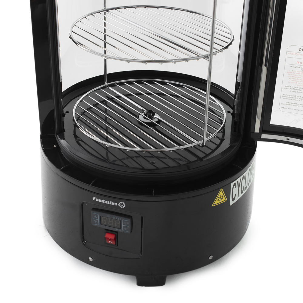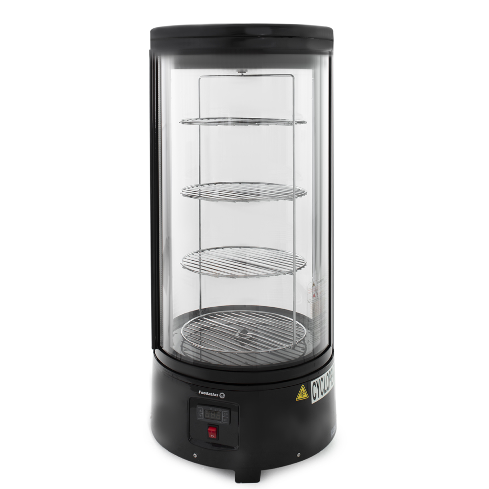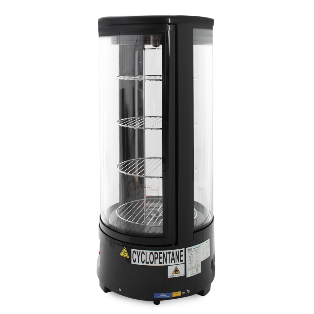 Объем холодильной камеры составляет до 72 л. Возможность устанавливать полки на различной высоте позволяет демонстрировать продукты любого размера. Круглую витрину можно установить на столе или другой горизонтальной поверхности. Оборудование изготовлено с учетом требований ГОСТ 15150-69. В работе используется хладогент R-600a/55.