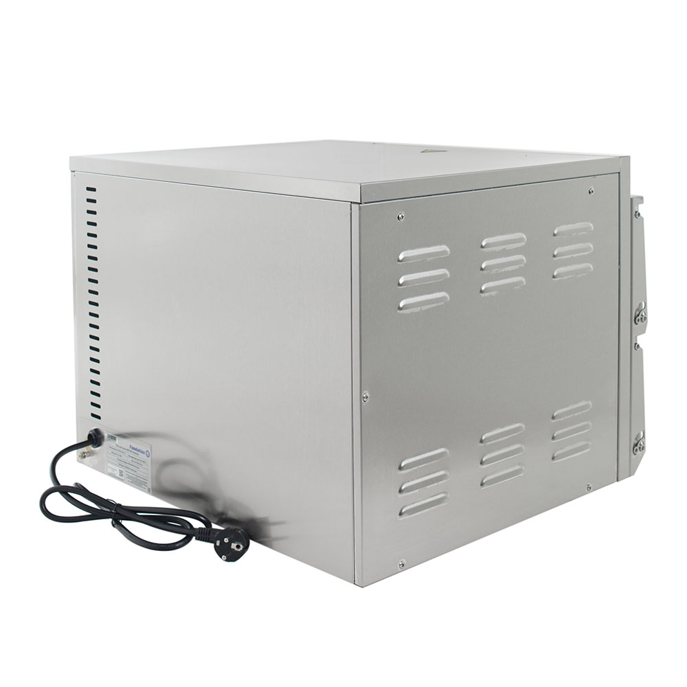 Устройство имеет корпус из нержавеющей стали, внутреннее покрытие из алюминия и ручки из не нагревающегося бакелита. На передней панели находятся 2 стеклянных смотровых окна. Прорезиненные ножки обеспечивают печи устойчивость на любых поверхностях.