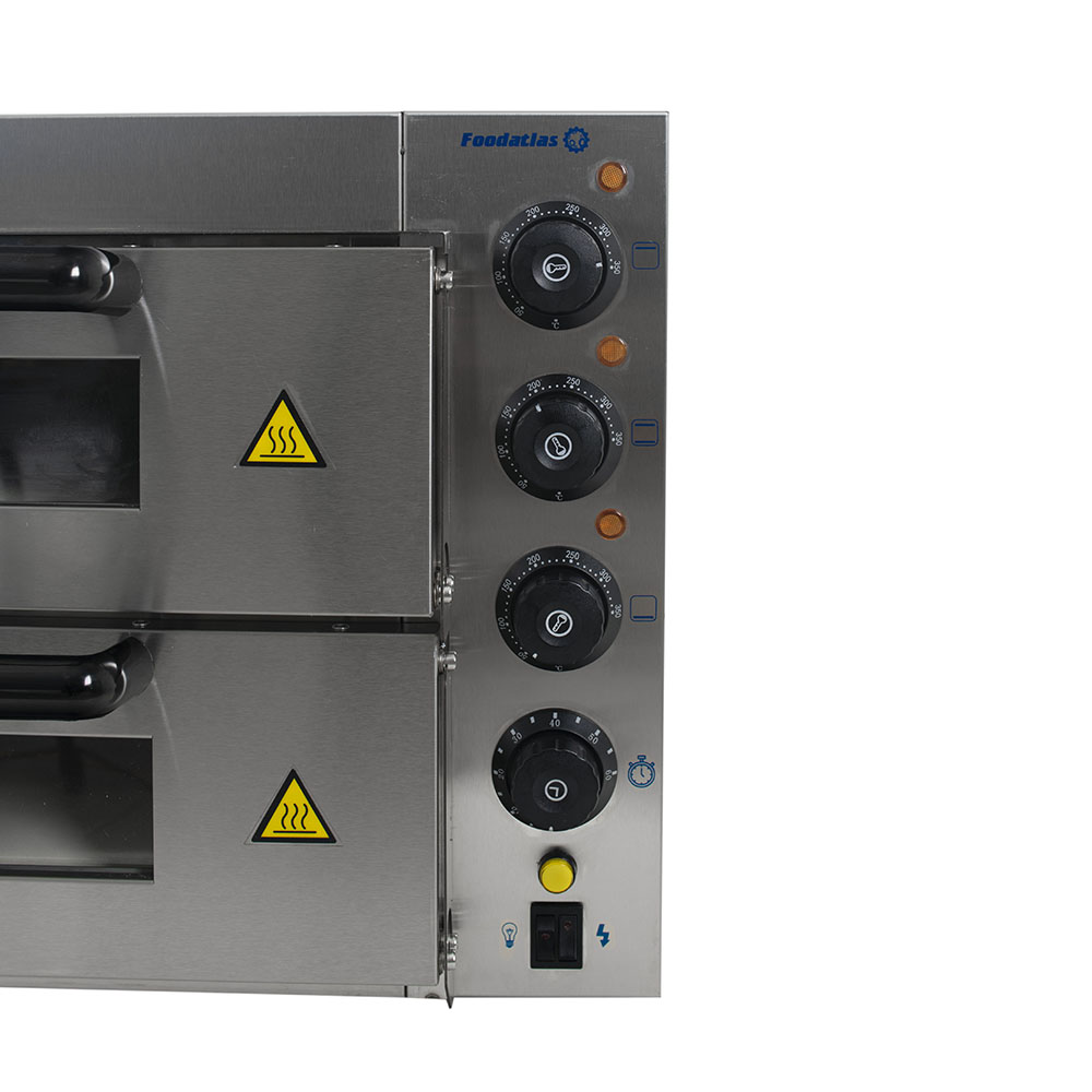 Оборудование имеет интуитивно понятную механическую панель, таймер и индикаторы нагрева. Заданная термостатами температура автоматически поддерживается в течение всего процесса работы. Купите печь для пиццы Foodatlas HEP-2ST и наслаждайтесь ее простым и удобным управлением.