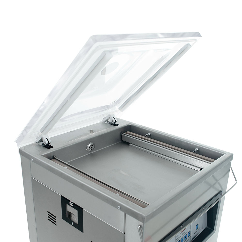 Камерный тип оборудования. Оборудование может иметь одну или две вакуумных камеры. Для двухкамерных упаковщиков так же есть подразделение на расположение камеры (одна на основном корпусе оборудования, вторая в корпусе подвижной крышки). Данная серия вакууматора идет без функции наполнения инертным газом (только для серии DZQ, для формирования и наполнения в виде “подушечки”).